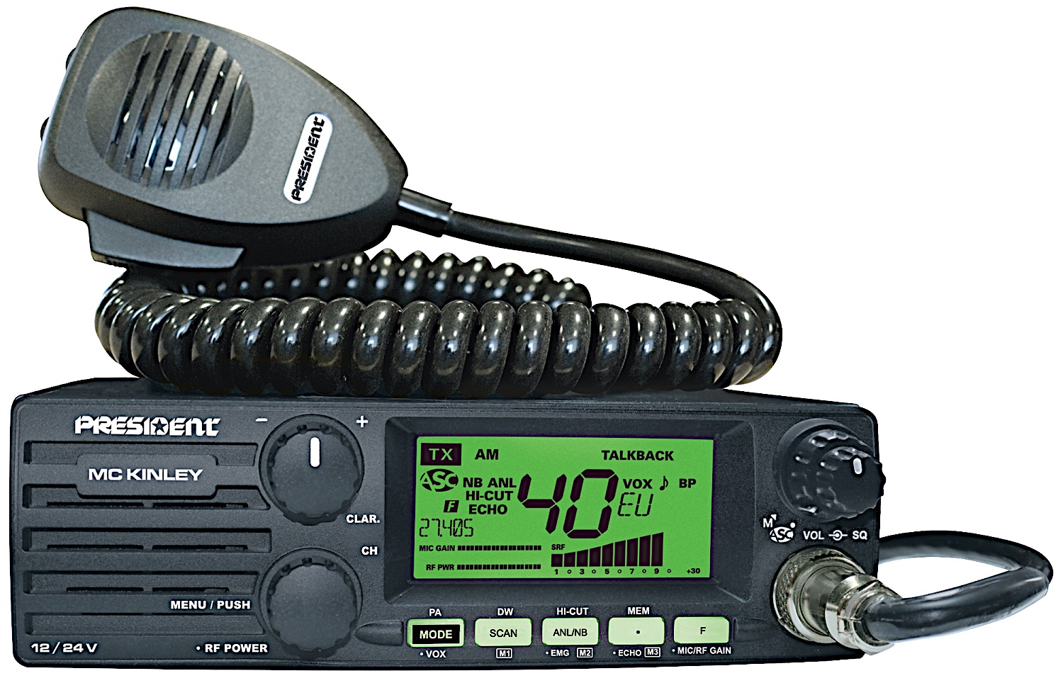 'President Mc Kinley' har 40 kanaler og har FM, AM, USB og LSB. Den er dermed ustyret med sidebånd! Den har en sendestyrke på 4 watt på FM og AM, og 12 watt på USB og LSB. Radioen virker både til 12 Volt og 24 Volt. Den har sin højttaler pegende fremad hvilket kan være en mulig fordel. Radioen kan købes hos I.C. Communication og Høeg Teknik.