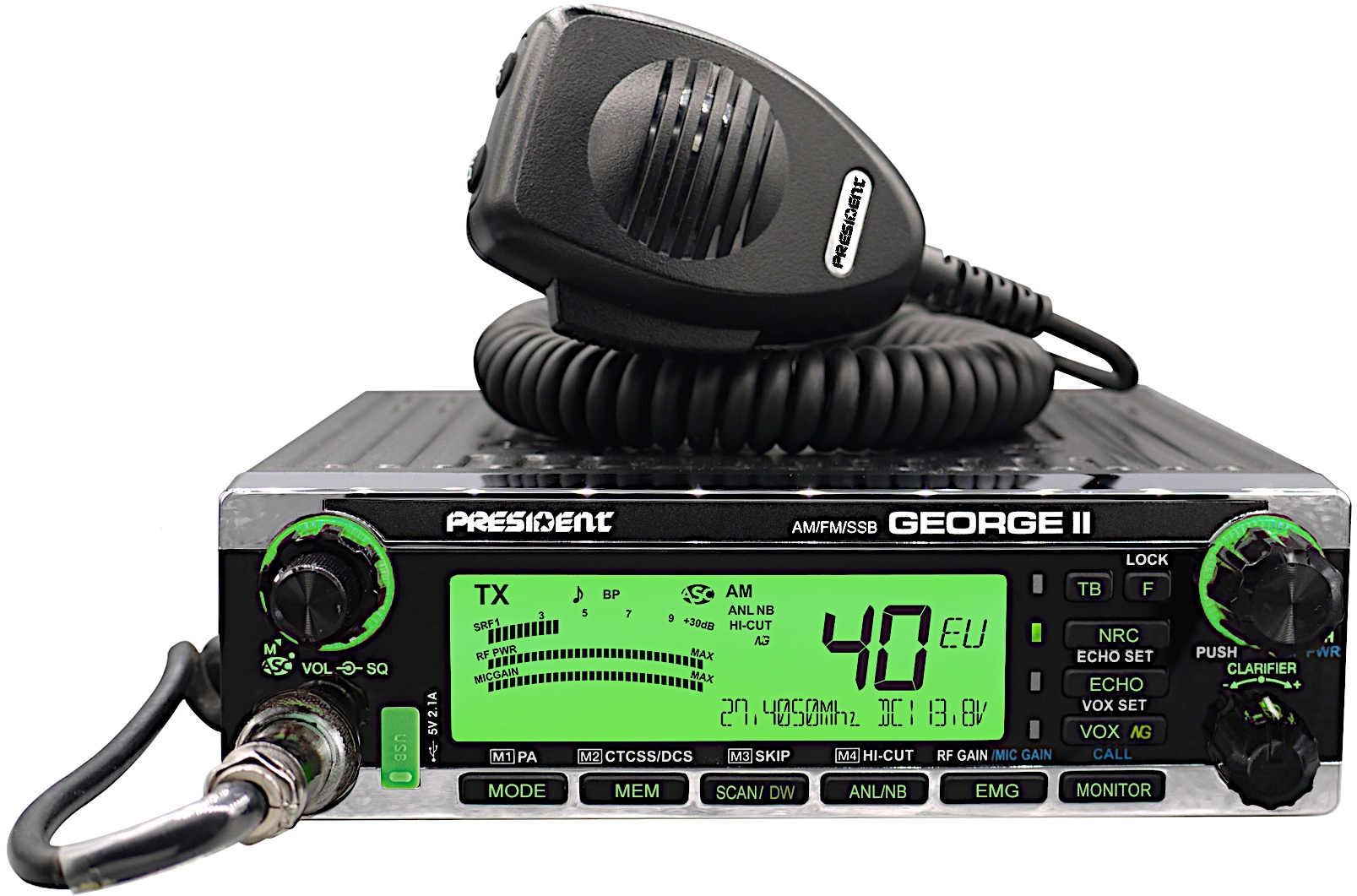 'President George II' har FM, AM, USB og LSB. Den er altså udstyret med sidebånd! Den har de 40 kanaler samt en sendestyrke på 4 watt på FM og AM, og 12 watt på USB og LSB. En CB radio med mange funktioner. Den kan købes hos I.C. Communication og Høeg Teknik.